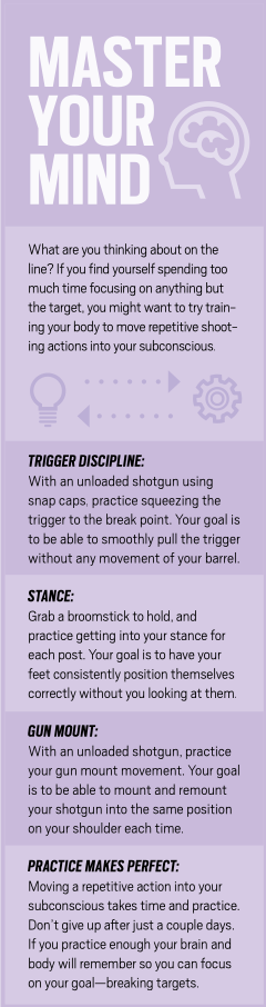 Training your body to make conscious shooting actions into subconscious instincts is a surefire way to increase your scores. Shooting actions like trigger discipline, stance, and proper gun mount are all great behaviors to make your body do automatically. All too often I see athletes change their stance each round or mount the shotgun in a different position on their shoulder almost every shot. Practice the action you want to train your body to become automatic at least 25 times a day. Over time you will see that these behaviors require less and less conscious thought as your mind “remembers” what your body needs to do. Put in the time to convert as many of your conscious movements to subconscious actions, and soon you will be breaking targets on a consistent basis without even thinking about it.